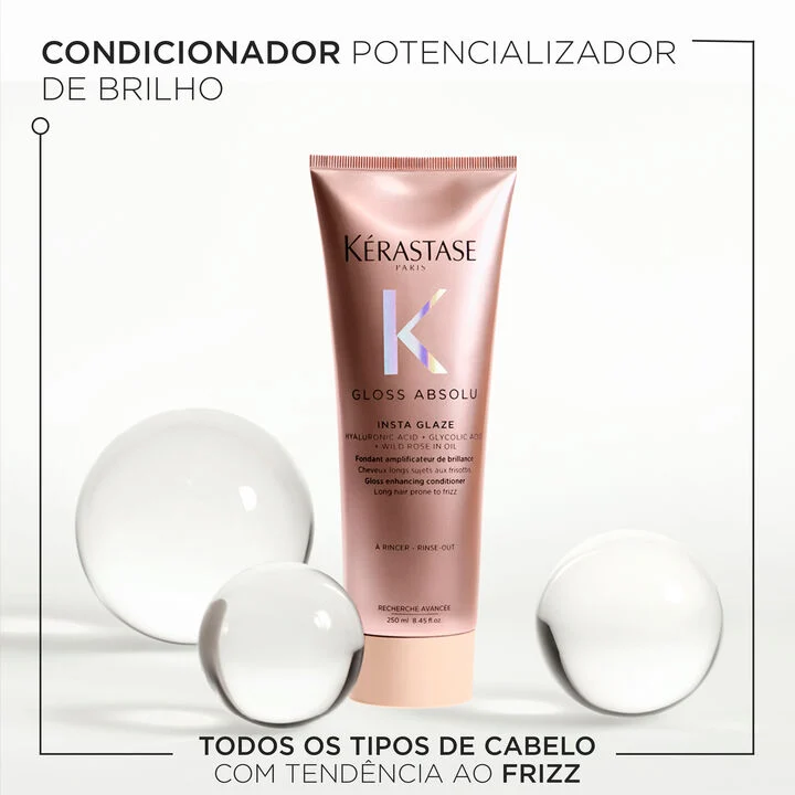 O Insta Glaze de Kérastase é um condicionador potencializador de brilho para todos os tipos de cabelo com tendência ao frizz. Foi formulado especificamente com Ácido Hialurônico, Ácido Glicólico e Óleo de Rosa Selvagem para proporcionar cabelos macios e brilhantes.
